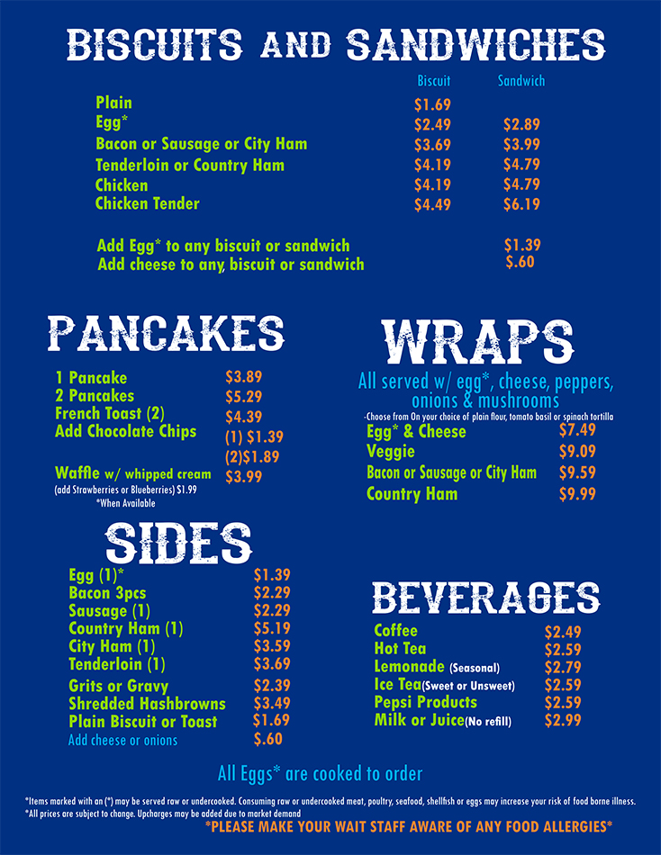 We offer a full breakfast menu and a variety of sandwiches, subs, burgers. home cooked meals, handmade pizza, seafood, pit cooked BBQ, mouth watering desserts and more.
