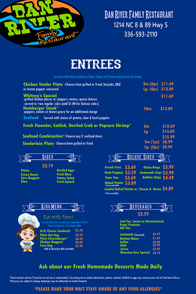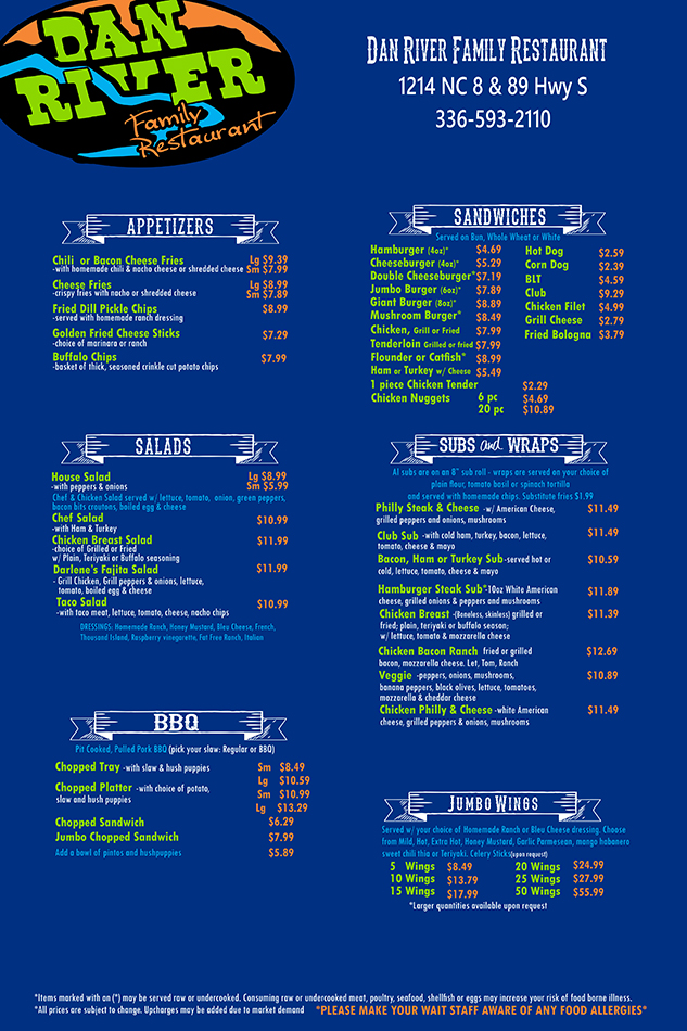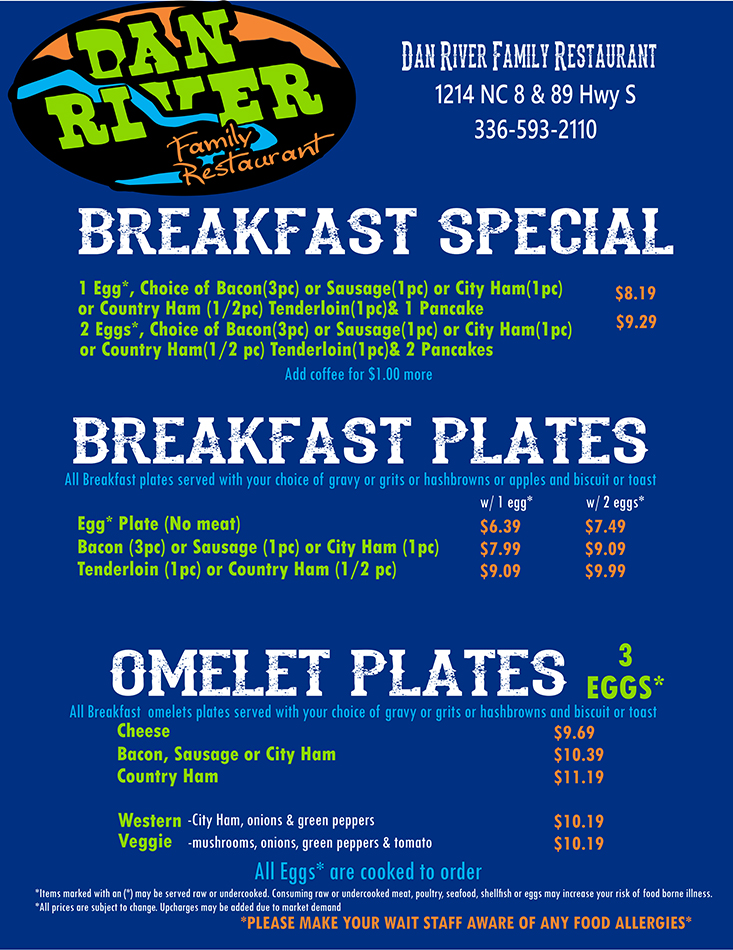 Dan River Family Restaurant, LLC offers a family friendly restaurant. We offer inside and outside dining. We are located just minutes from Hanging Rock State Park. Please stop by and see us on your next way through.